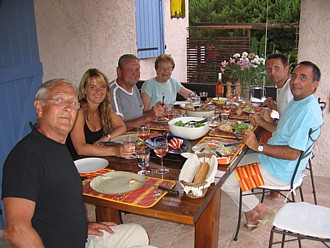 Grillkveld med våre meget gode naboer. Marcel og Juliet ved siden av Elisabeth. De snakker bare franske men vi klarer å få formidlet det meste begge veier. Francois som sitter ved siden av Bjørn er naboen rett i front av innkjøringen til huset. Han har vært til meget stor hjelp og snakker bra engelsk. Francois har nøkler til huset og nei er ikke i hans munn dersom noen trenger hjelp.