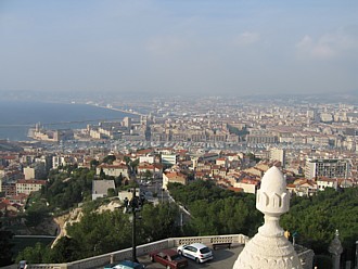 Fra toppen av Marseille (under). Her oppe ligger en flott katedral med utsikt 360 grader over Marseille. Dersom en vil slippe å kjøre helt opp er det en fin tur å ta turist toget fra innerst i marinaen. Grei måte å få se litt av byen. Store parkeringshus ligger i tilknytning til marinaen og det er bare 2 min å gå til hovedhandlegaten som er bilfri. Alle typer butikker samlet på ett relativt begrenset området. Resturanter i alle klasser ligger rundt på torvene. Selv om Marseille er en stor by er det bra skilting og ikke noen problemer å komme seg inn og ut av byen.